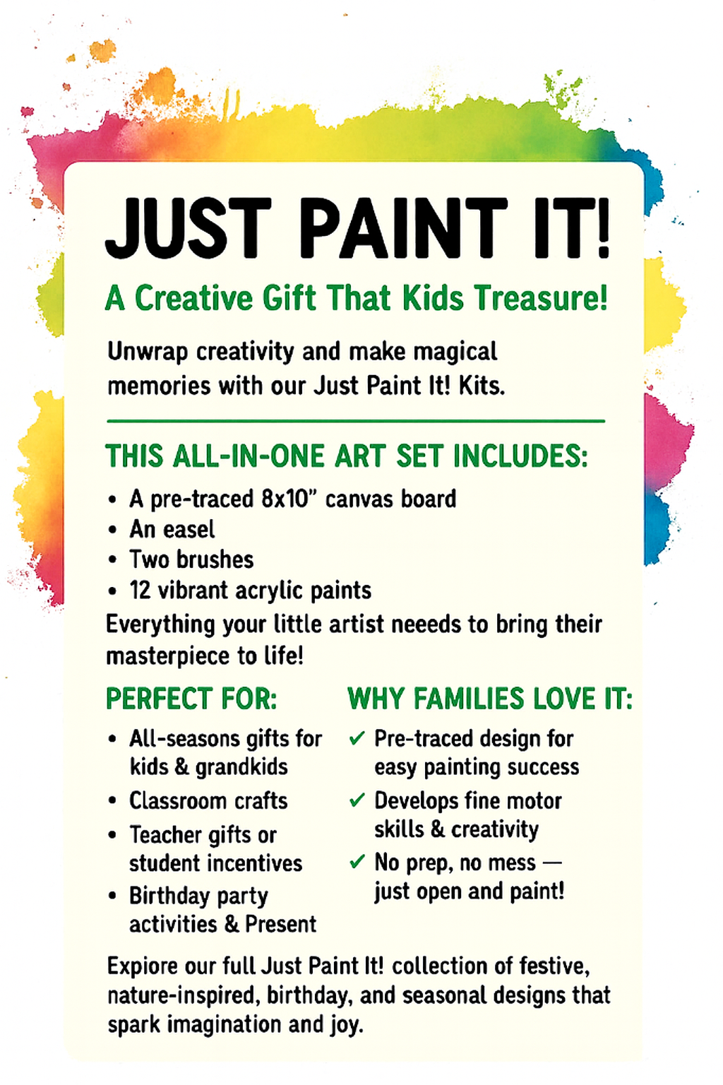 Explore a full collection of festive, nature-inspired, birthday, and seasonal designs in our Just Paint It! line.
